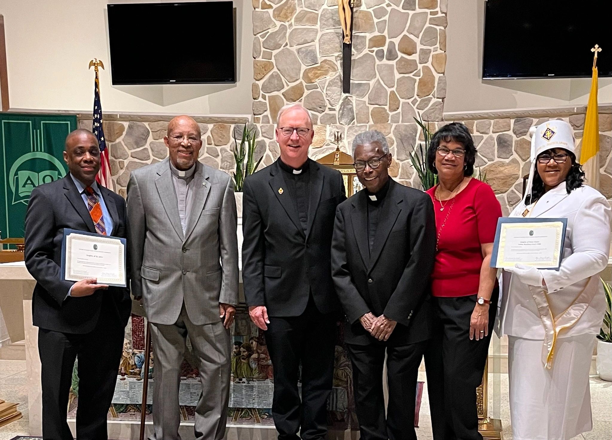 A beautiful and joyful Mass was celebrated this afternoon to honor Black History Month. Pictured from the left are: Stephen Williams (Knights of St John); Deacon Bill Johnson; Father Vince Guest; Monsignor Leonard Scott; Cheryl Wright (Chairperson of the Black Catholic Ministry Commission); and Lisa Coley (Knights of Peter Claver, Ladies Auxiliary).